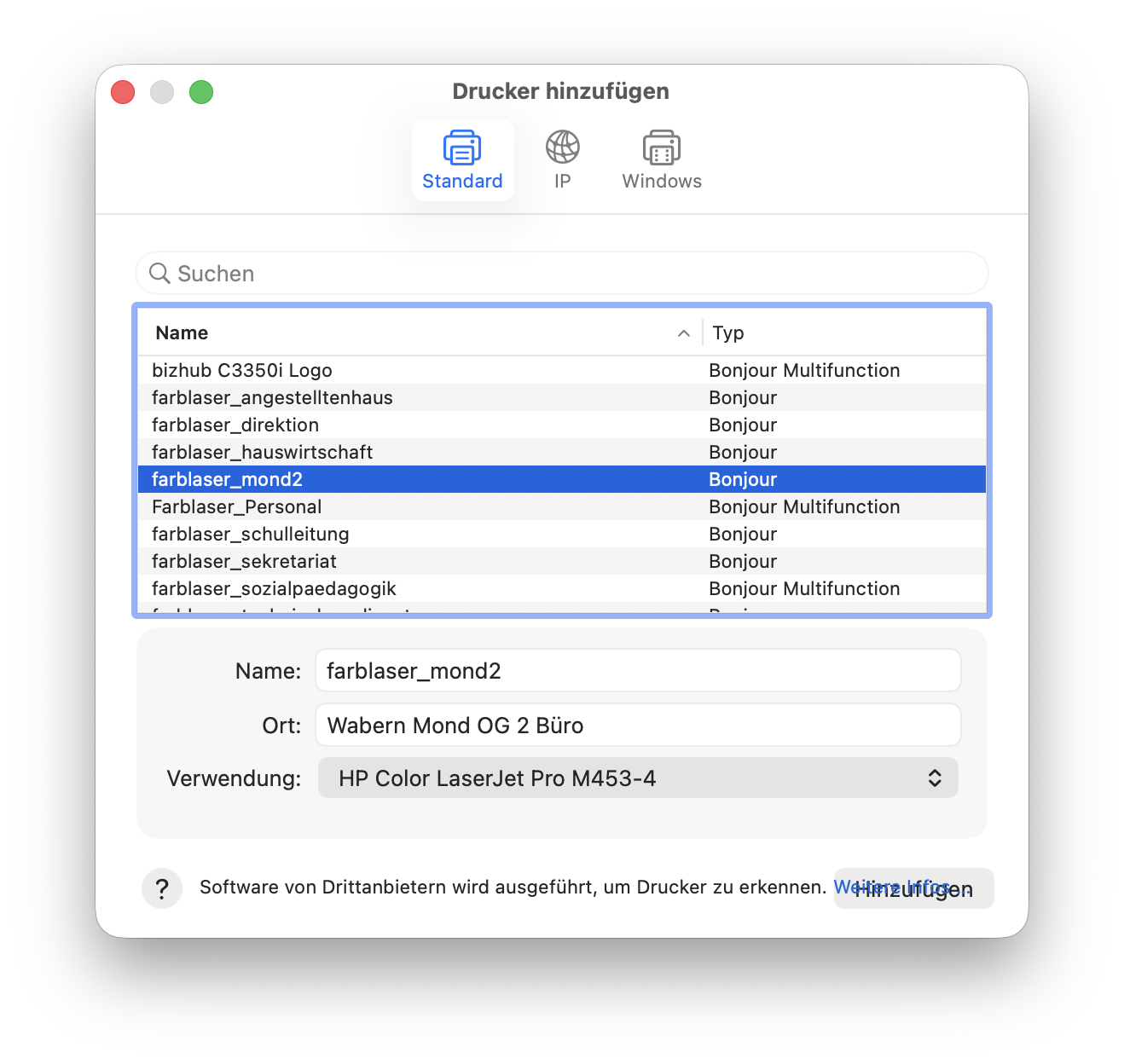 Wähle den gewünschten Drucker. Name, Ort und Verwendung wird automatisch ausgefüllt.