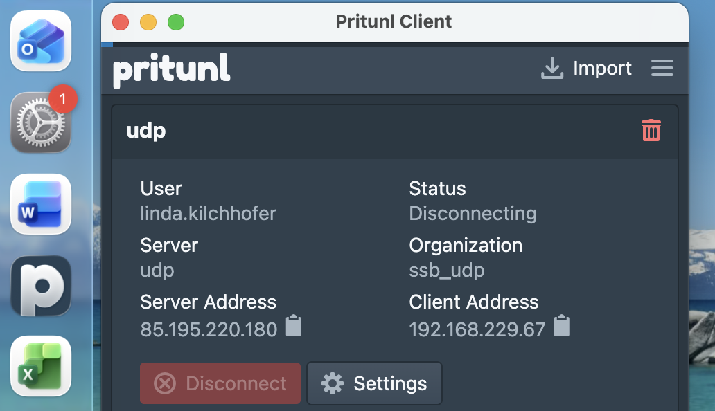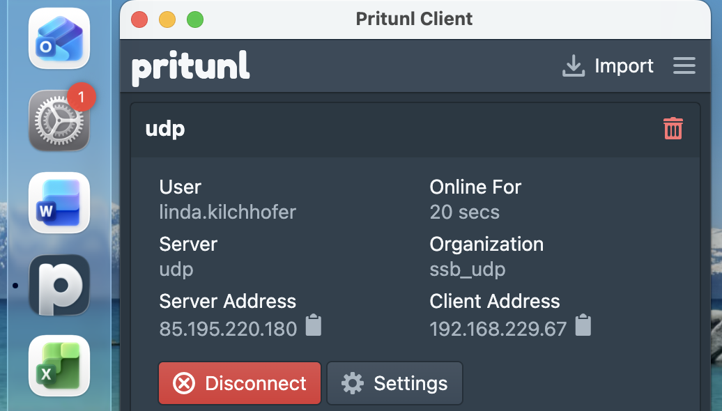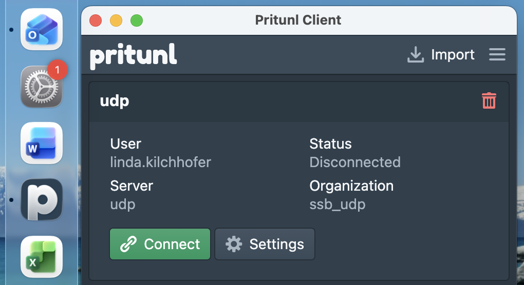 | 2. Starte die App pritunl und klicke den grünen Knopf Connect. | |