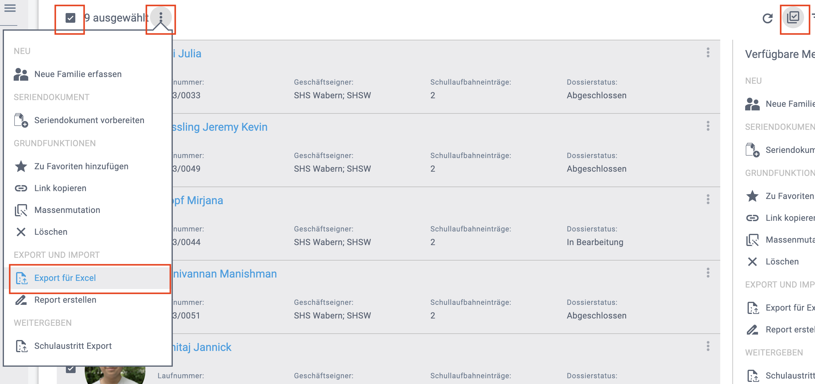 Wähle alle Lernendendossiers aus, welche du exportieren willst.