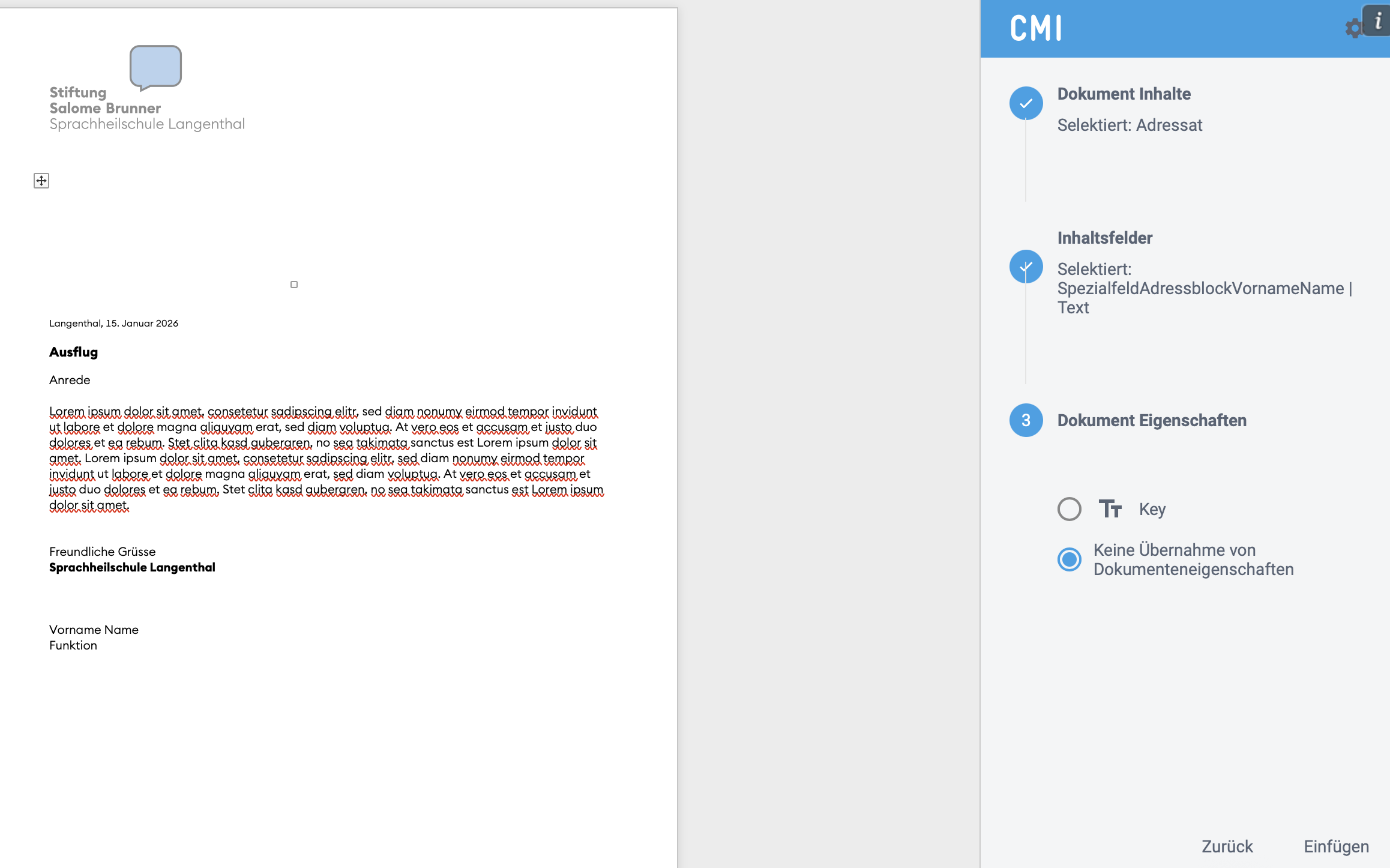 | 4. Nun kannst du die Inhalte, welche ersetzt werden sollen im CMI Add-In auswählen. Wähle z. B. "Adressat" dann das Feld "SpezialfeldAdressblockVornameName" und füge dies ein. | |