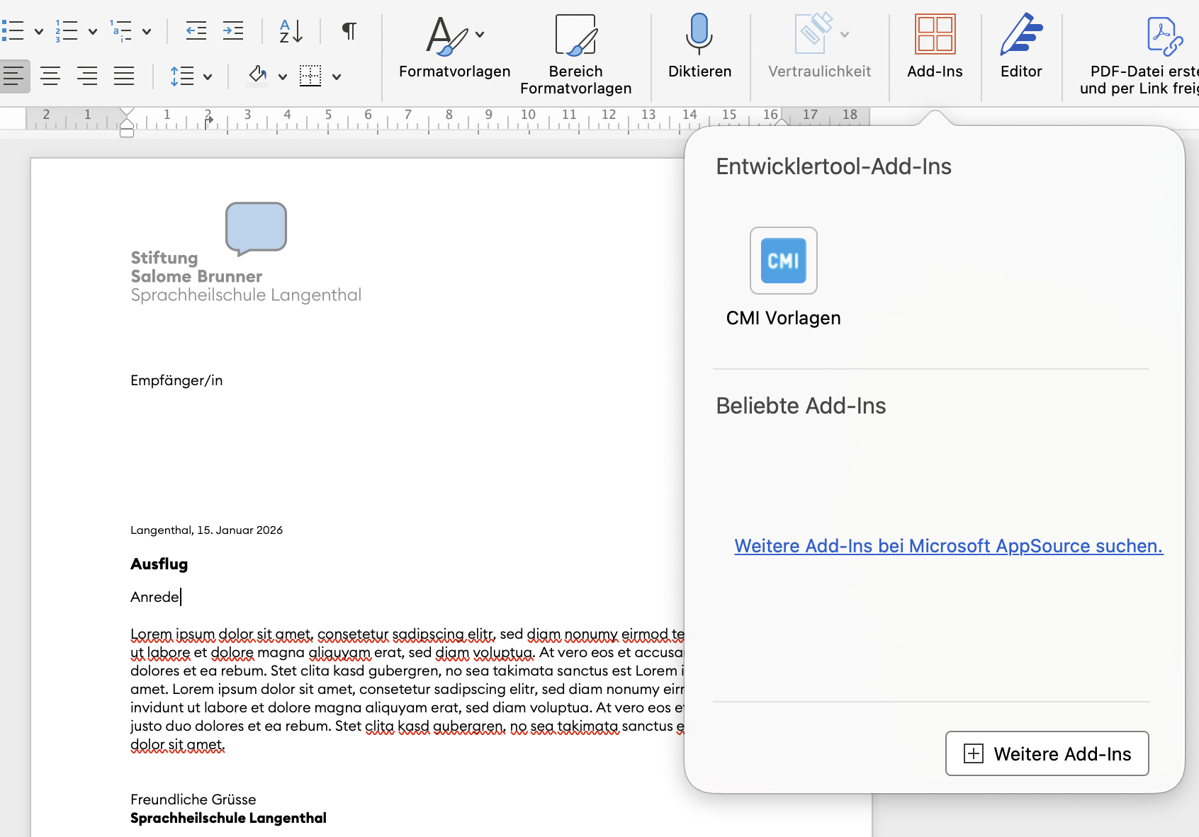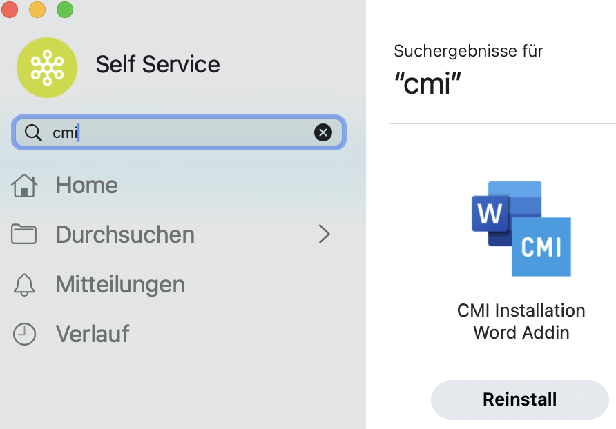| 1. Du brauchst das CMI Add-In für Word. Dieses steht im Self Service zur Verfügung. Installiere das Add-In. | |